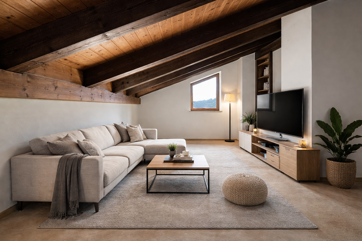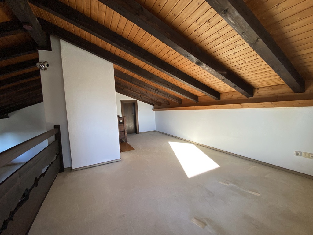 Eine halbe Etage höher öffnet sich der großzügige Wohnbereich, der durch den hohen Dachstuhl ein beeindruckendes Raumgefühl vermittelt. Der offene Kamin schafft besonders in den kühleren Monaten eine gemütliche Atmosphäre. Von hier gelangen Sie auf den großen, überdachten Balkon in Süd-West-Lage, der einen wunderbaren Platz zum Entspannen bietet.
