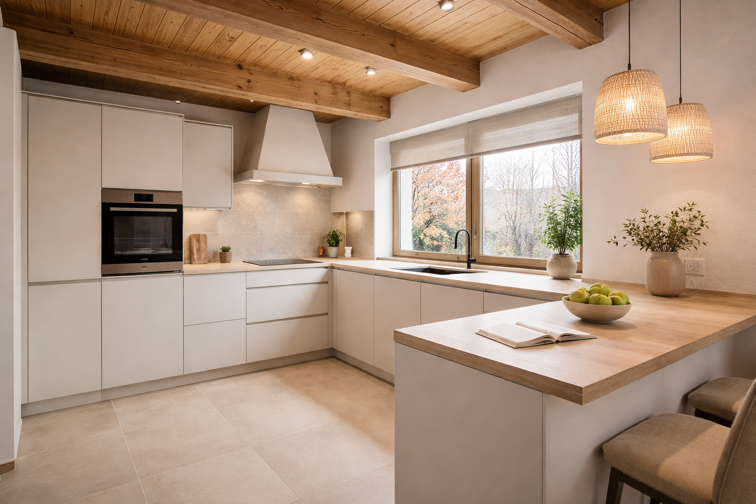 Die Küche mit angrenzendem Essbereich bildet einen zentralen Treffpunkt des Hauses und bietet direkten Zugang zur Terrasse in sonniger Südlage. Der hier integrierte Kachelofen sorgt in den Wintermonaten für eine besonders behagliche Atmosphäre und spendet angenehme Wärme im gesamten Wohnbereich.