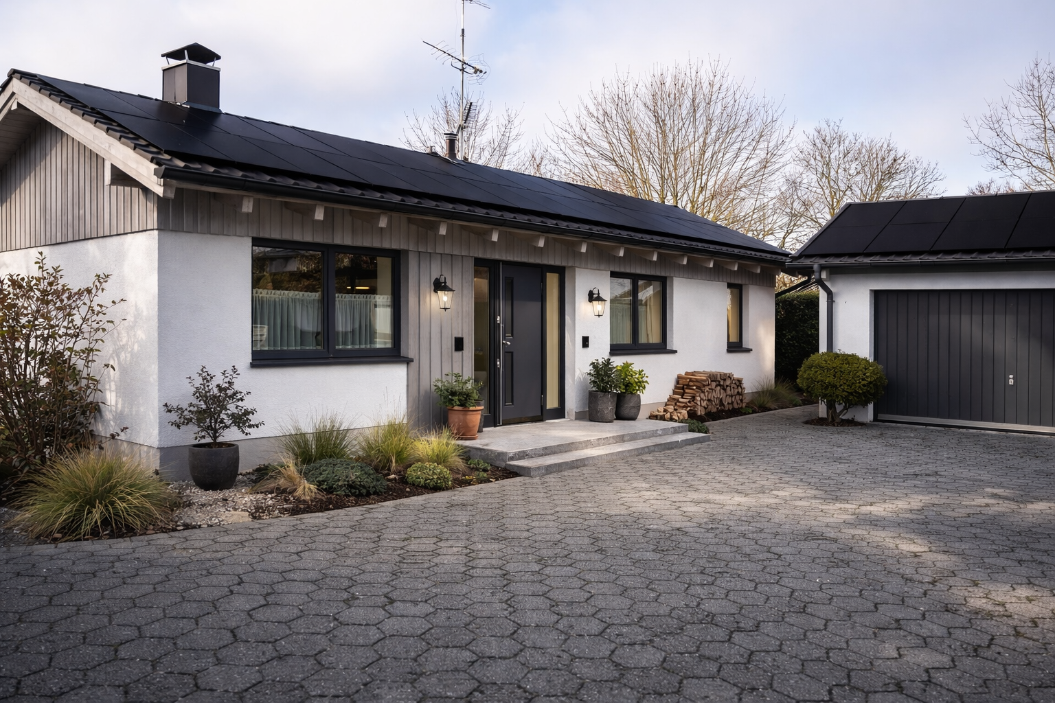 Die großzügige Einfahrt mit Doppelgarage bietet komfortable Parkmöglichkeiten.